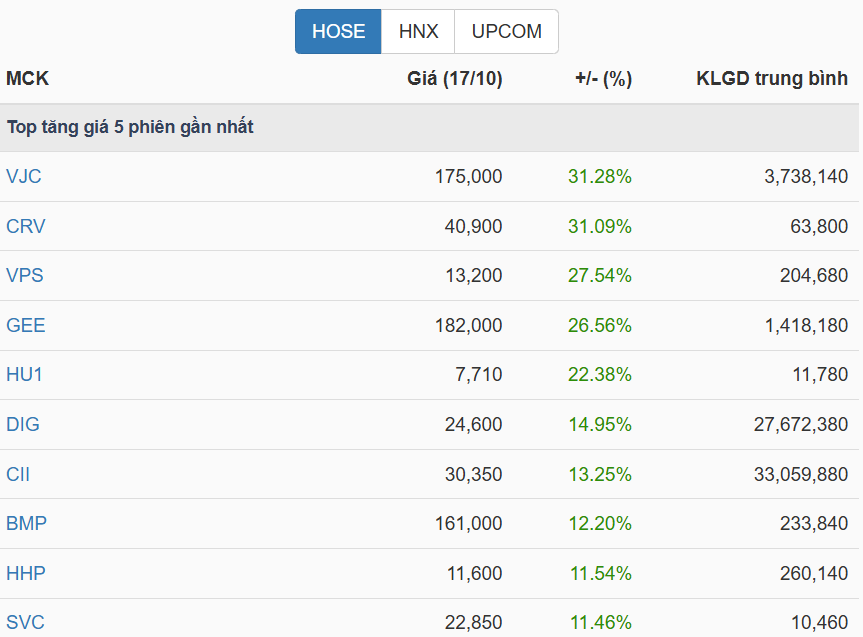 Top cổ phiếu tăng giá 5 phiên gần nhất