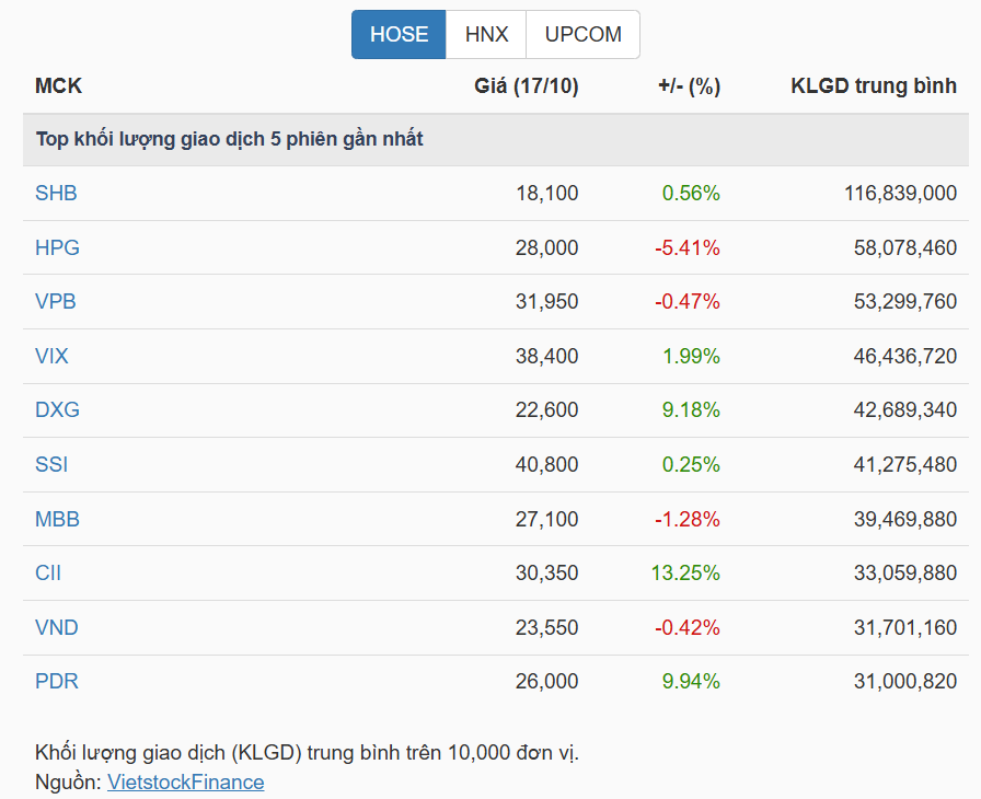 Top cổ phiếu có khối lượng giao dịch 5 phiên gần nhất.