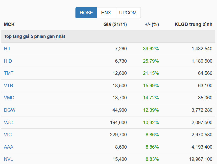 Top cổ phiếu tăng giá 5 phiên gần nhất