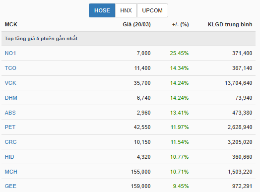 Top cổ phiếu tăng giá 5 phiên gần nhất