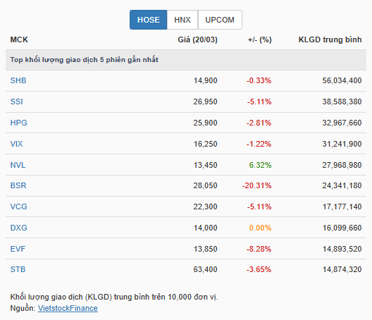Top cổ phiếu có khối lượng giao dịch 5 phiên gần nhất