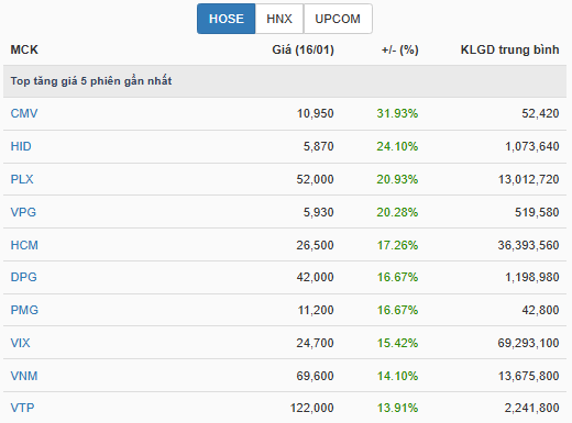 Top cổ phiếu tăng giá 5 phiên gần nhất