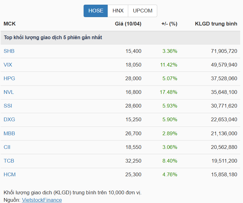 Top cổ phiếu có khối lượng giao dịch 5 phiên gần nhất