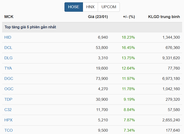 Top cổ phiếu tăng giá 5 phiên gần nhất