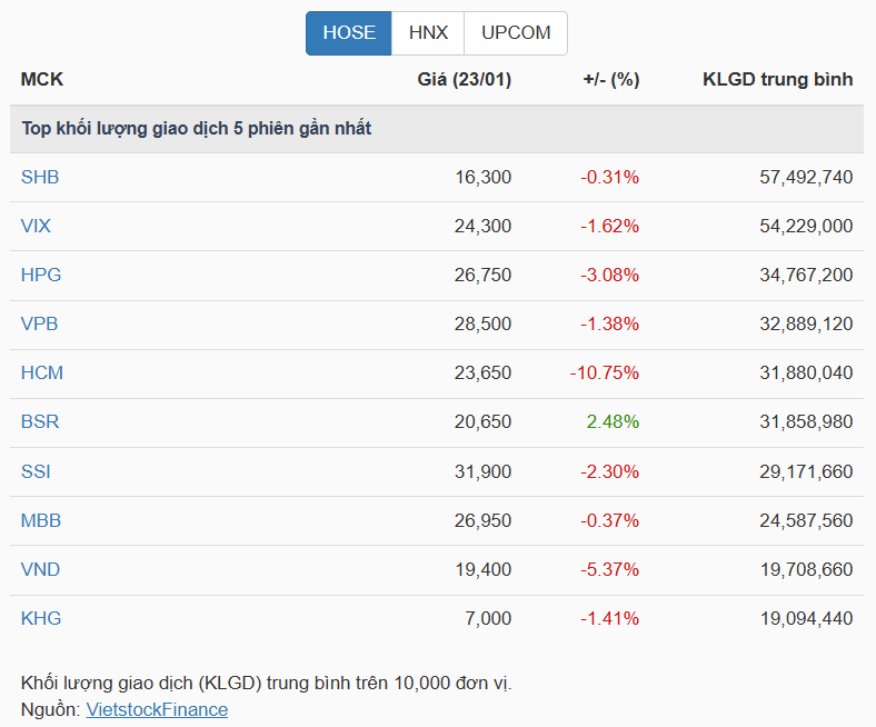 Top cổ phiếu có khối lượng giao dịch 5 phiên gần nhất